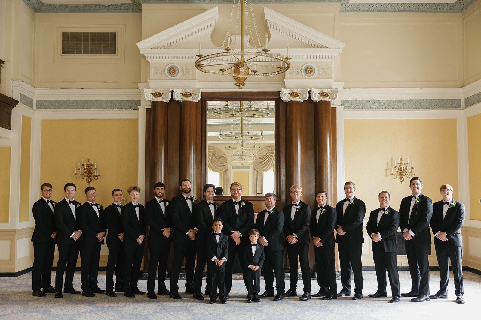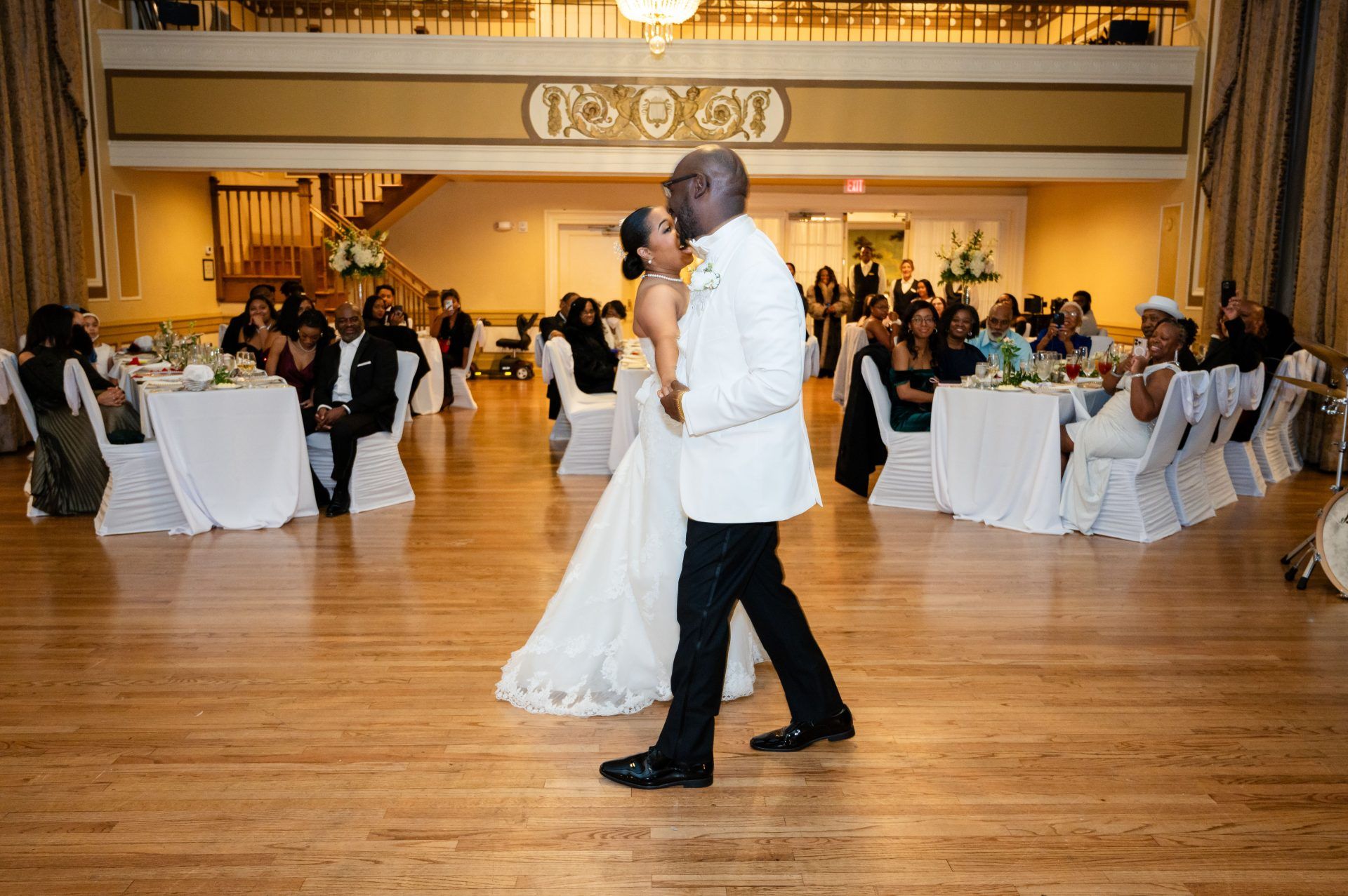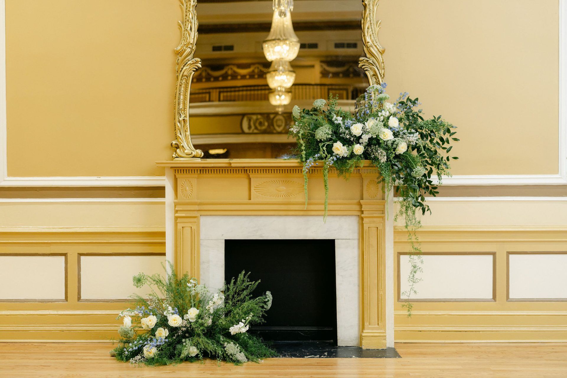 This original ballroom of the hotel is adorned with gorgeous handcrafted trim and moldings.The most notable features of the ballroom are the hardwood floors, crystal chandeliers and fireplace with an antique mirror. The ballroom also includes an orchestra balcony.
